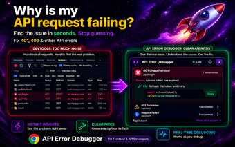 開発者のワークフローを向上させることに重点を置いたAPIエラー デバッガーは、スマートリクエスト分析、認証トラブルシューティング、ネットワークリクエストモニタリングなどの機能を提供します。フロントエンドおよびバックエンド開発、APIテスト、品質保証に最適で、構造化されたエラー詳細を瞬時に表示することで時間を節約し、認知負荷を軽減します。このツールは、Chrome環境内でAPIの問題を効率的にデバッグする必要があるすべての人に最適です。